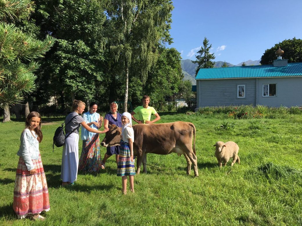 Дорога на Светлый мыс была недолгой. По приезду нас встретила руководитель Детского дома Гульнара, которая для всех его обитателей просто мама. Сейчас там 18 детей, все выпускники имеют высшее образование, работают, женятся и выходят замуж. У Гульнары уже 20 внуков. Сначала мы зашли в часовню в честь Иконы Божией Матери "Одигитрия", сохранившейся здесь с тех времён, когда был монастырь. Ей уже сто лет. Поклонились иконам, посмотрели редкие фотографии старых лет, фото насельников монастыря. Затем ребята из детского дома провели для нас экскурсию. У них хозяйство: коровы, овцы, кони, кролики, куры, собаки и кошки. Мы гуляли по невероятно красивым местам, где горы отражаются в озере, плещется рыба, трава, как в песне, по пояс, огромные деревья и синее-синее небо. В завершении экскурсии мы подошли к старинной мельнице, построенной без единого гвоздя, которую ребята из детского дома уже потихоньку начинают реставрировать.