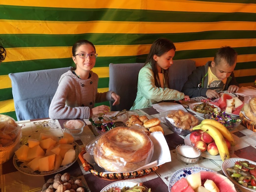 В первый день пути мы посетили Кафедральный Воскресенский собор г. Бишкека, где приложились к мощам Ираклия Иссык-Кульского, руководитель паломнического отдела Неонила Максимовна провела для нас экскурсию по территории собора. После обеда мы отбыли в заветный путь - на побережье озера Иссык-Куль в г. Балыкчи, где остановились на три дня при храме в честь блаж. Ксении Петербуржской. Настоятель храма, о. Афанасий окормлял нас духовно и, незаметно для нас, старался устроить наш быт наиболее интересно для детворы и удобно для взрослых. Назидательно, с огромной любовью, тонким и добрым юмором, с заботой и пониманием он молился с нами, читал нам вслух за трапезой, исповедовал, подсказывал, смотрел с детворой полезное кино, беседовал со всеми вместе и по отдельности. Мы ходили на пляж, купались и ныряли с пирса, от души любовались закатами, рисовали пейзажи, и под руководством батюшки скорректировали свою дальнейшую программу так, чтобы посмотреть как можно больше красивых и благодатных мест на Иссык-Куле.