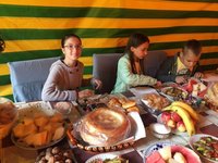 Посетили курорт Иссык-Ата – Кыргызские Карловы Вары, только вид на горы гораздо красивее. Там горячий родоновый источник, и мы купались в бассейне с горячей водой под открытым небом. Затем обедали и долго гуляли по ущелью. Поскольку в этот день было окончание мусульманского поста, то кормили нас богатыми яствами в честь айта и на десерт подавали арбузы с дынями, конфеты и боорсоки и прочую выпечку. К вечеру прибыли в Бишкек и разместились в отеле с комфортабельными номерами.