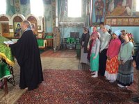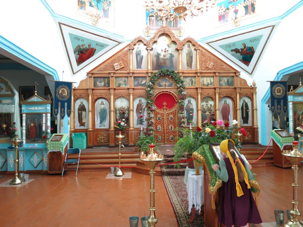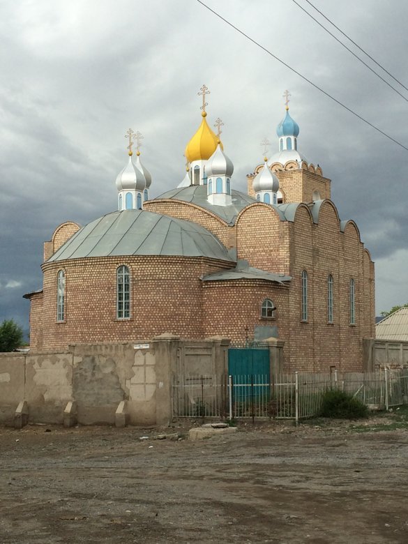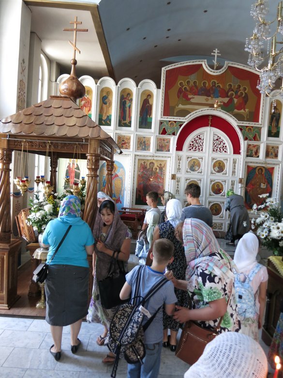 В городе Кара-Кол (бывший Пржевальск) в храме Святой Троицы нас встретил настоятель о. Сергий. Он рассказал непростую и очень интересную историю храма, которому за все годы его существования довелось гореть, быть клубом, спортзалом, отстраиваться заново, реставрироваться и выстоять. Мы все прикладывались к чудотворной иконе Тихвинской Пресвятой Богородицы, единственной святыне, которая сохранилась из разрушенного монастыря на Светлом мысе. Икона даже прострелена в двух местах.