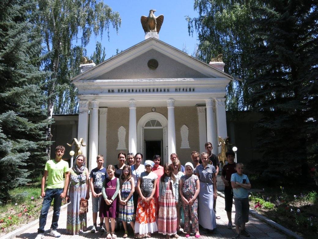 Наутро после завтрака мы отбыли в город Кара-Кол и по пути посетили село Тюп – церковь Казанской иконы Божией Матери, где нас тепло встретил Иеромонах Феогност. Он провёл небольшую экскурсию по храму, рассказал о воскресной школе, где сейчас учится 17 учеников и одна девочка заняла первое место по епархии в викторине по Закону Божьему, мы купили мёда у местных жителей и направились далее, в музей Пржевальского.