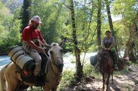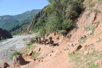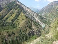 18 июля мы выдвинулись в долину реки Каракульджа, туда, где ранее располагалось село Алатай Джалал-Абадской обл. Токтогульского р-на. Это – заповедная дикая местность, в которую лишь летом приезжают пасечники; выгон скота и ловля рыбы здесь запрещены. Здесь водятся медведи, волки, высоко в горах есть илбирсы – так здесь называют снежных барсов. Поселение Алатай находится примерно в 77 км от г. Токтогула. Первые 30 км дороги наша автоколонна, состоящая из трех специализированных машин и спринтера, прошла по асфальту. Затем – 35 км по грунтовой горной дороге, которую чудом преодолел спринтер, потеряв бампер. Дважды ему пришлось переезжать через горную реку, дважды он увяз в грязи – егеря позже скажут: «Такая машина здесь проехала впервые!» Дальше дороги не было. Ее накрыл сошедший этой весною селевой поток. Группу здесь уже ждали три проводника с семью лошадьми. Остальные 12 км команда шла по обрывистой горной тропе, заросшей кустарником, через горные речки, частью – на навьюченных лошадях, частью – пешком.