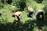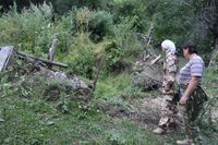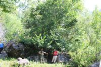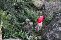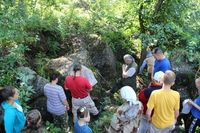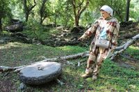Дойдя до места и разбив лагерь, команда вышла на поиски. Сначала провели опрос. Жительница, одна из немногих оставшихся здесь, провела нас по заброшенному поселку и показала предметы традиционного быта русских переселенцев, мельничные жернова, разрушенную кузницу, фундамент дома, землянки. Нас больше всего заинтересовали остатки построек, ведь по исходным данным, собранным для экспедиции епархиальным историком Е.Е. Озмитель, необходимо было искать место жительства и любые сведения о большой благочестивой семье Козулиных. Это – несколько раскулаченных братьев с их многодетными семьями, из которых вышло много священников. В 1930-1940-х годах у них постоянно проживали монахи и монахини и, самое главное, св. старец Серафим (Романцов). Старец научил Козулиных, как делать домашнюю церковь, служил у них, крестил их детей, а летом уходил в горы, где подвизался в уединении. Рассказывали, что он молился под большим косым камнем, куда ему приносили еду. Со слов дальних родственников семьи Козулиных (семьи Дунай), их тетю Александру 1934 года рождения, когда она еще была ребенком, тайно приводили причащать в сооружение из камней в дальнем конце огорода.