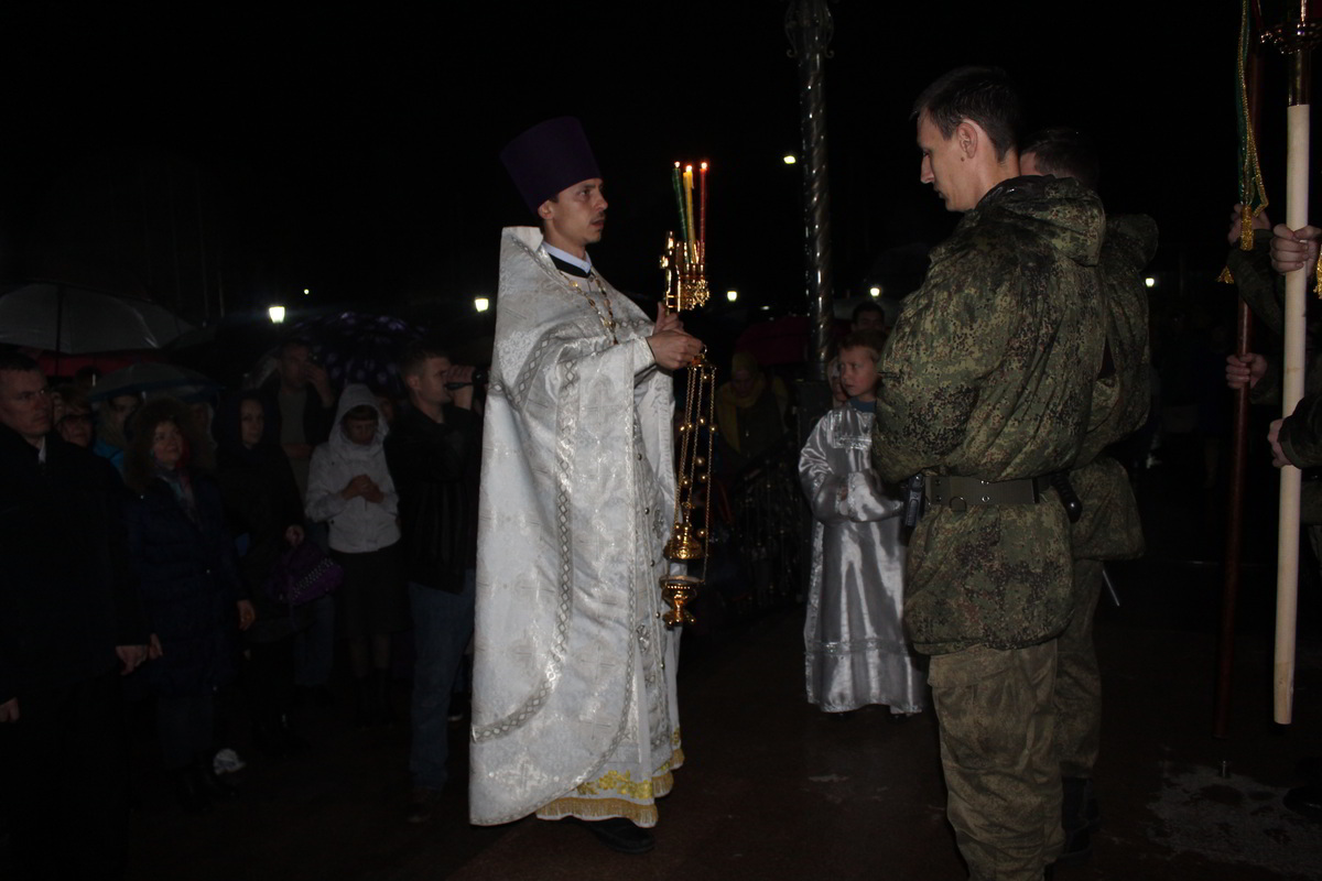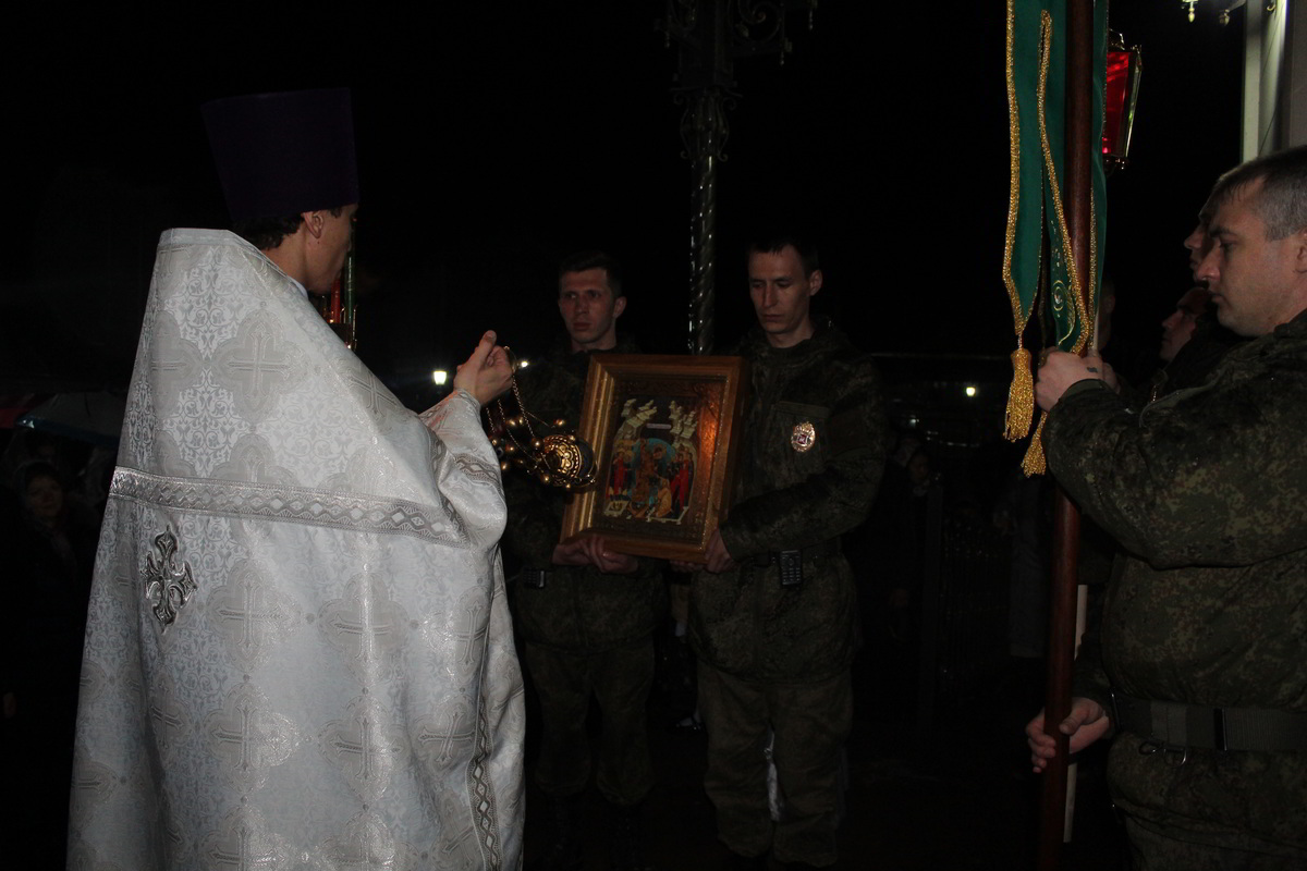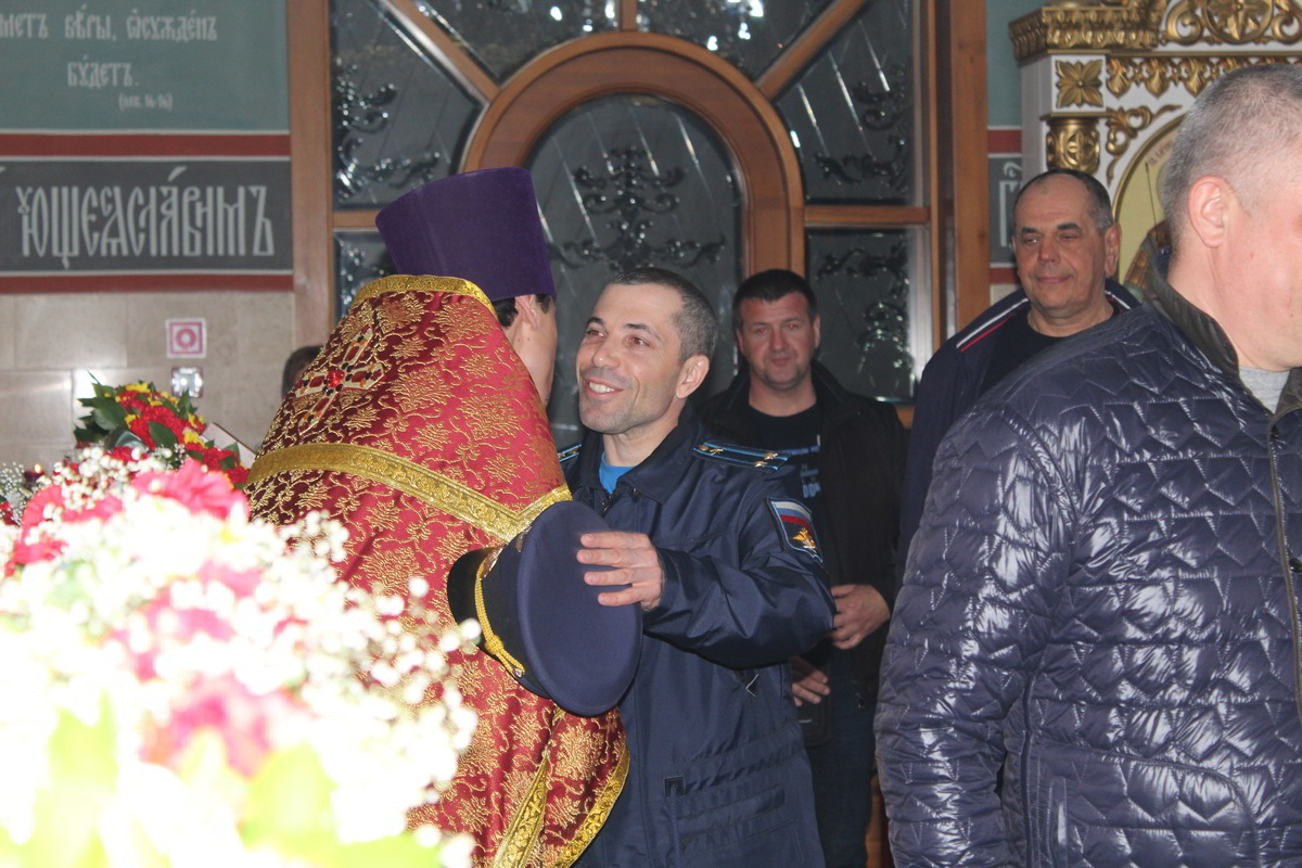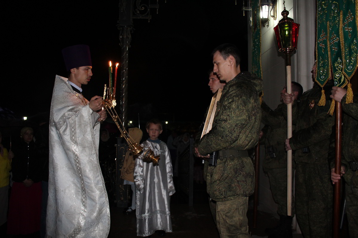В ночь с 7 по 8 апреля, на территории 999 авиационной базы ОДКБ «Кант» в Храме Александра Невского, во главе с настоятелем храма иереем Евгением Циклаури, прошла торжественная служба в честь светлого Христово Воскресения Пасхи.