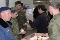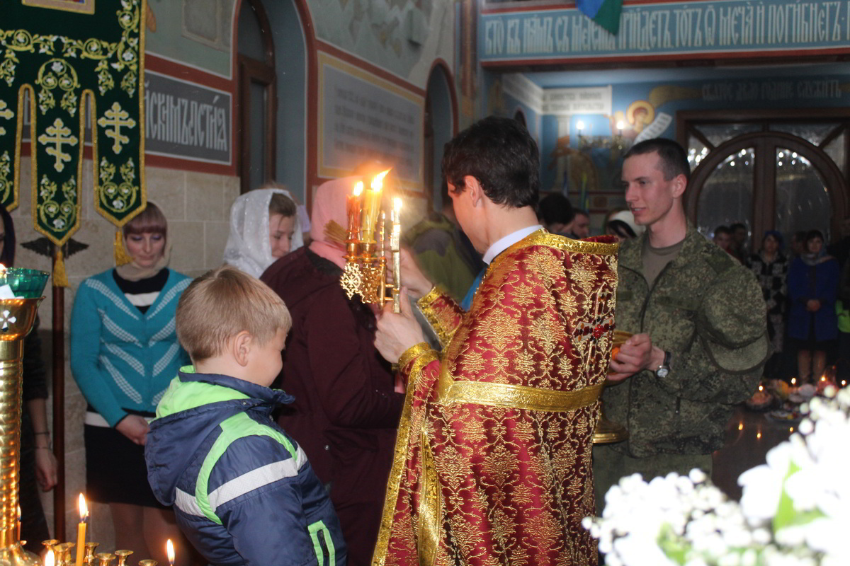 Без внимания не остались и нуждающиеся! По традиции, сложившейся на приходе при воинской части, после освящения, народ разделял свою радость в виде куличей, яиц и других сладостей, жертвуя в общую пасхальную корзину.