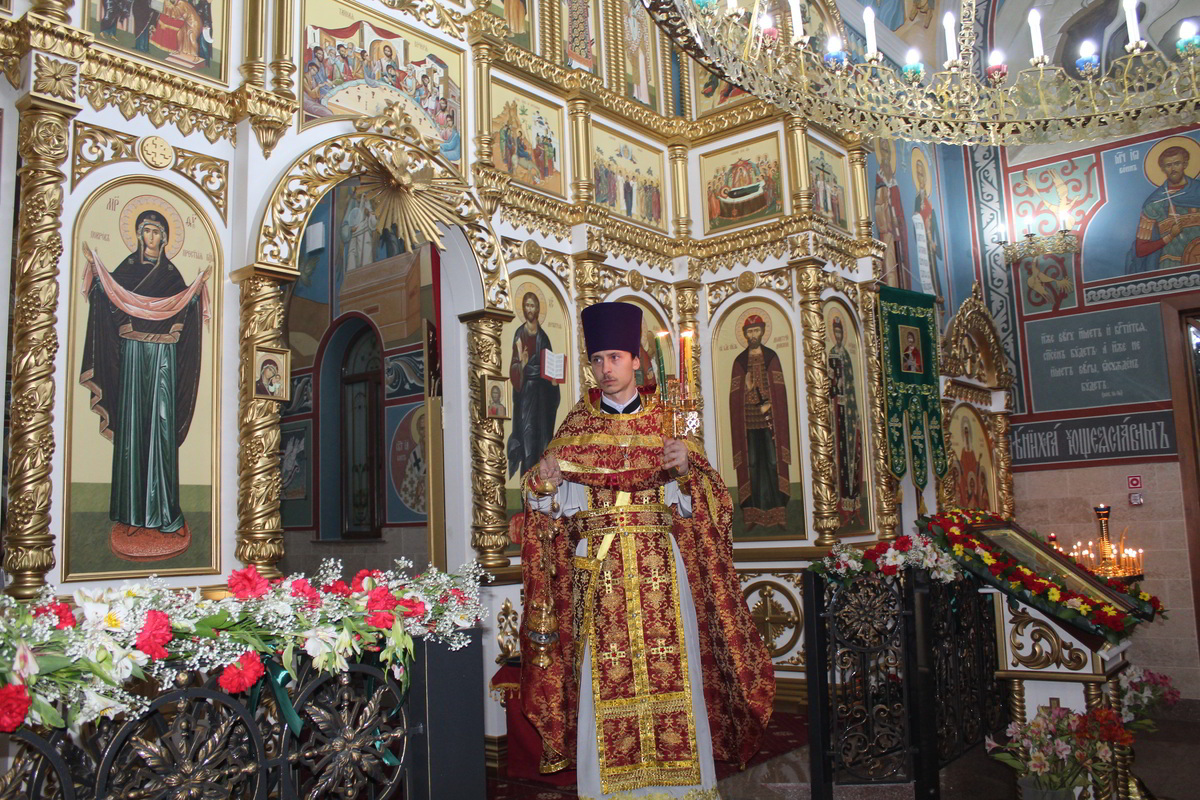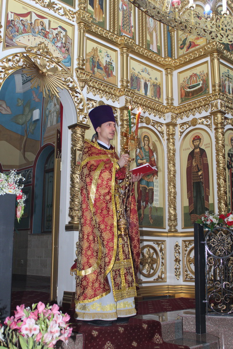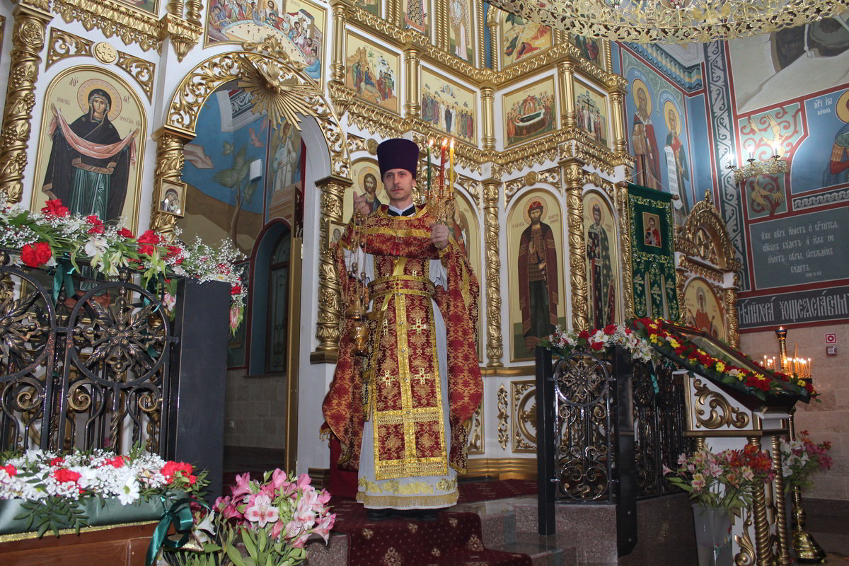 Пасха считается самым главным праздником в православной вере. В этот день храм украшен цветами, зажжены свечи и лампы, в каждом углу храма. Так же священники сменяют черную одежду на светлую. Храм был переполнен прихожанами, которые пришли помолиться на службе. По традиции православного народа в Пасхальную ночь прихожане принесли с собой в храм твороженную Пасху, пасхальные яйца, куличи и другие угощения, чтобы осветить после завершения Божественной Литургии. В процессе пасхальной службы иерей Евгений с прихожанами совершили крестный ход, была осуществлена пасхальная заутреня, и затем прозвучала Божественная Литургия.