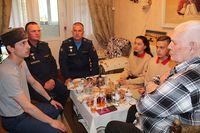 Для ветерана была подготовлена провизия и памятные сувениры. За чаем, ветеран рассказывал об истории тех времен. Ему было приятно видеть подрастающее поколение и то, что они не забывают навещать старика ветерана