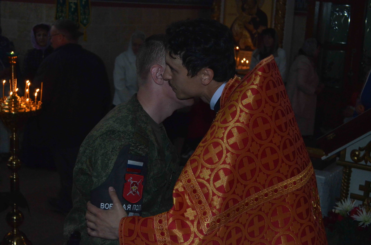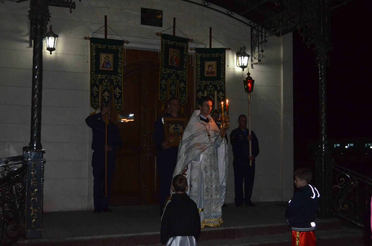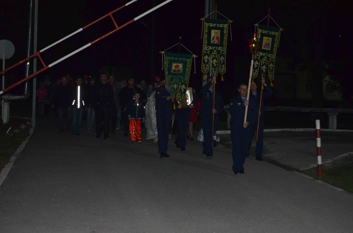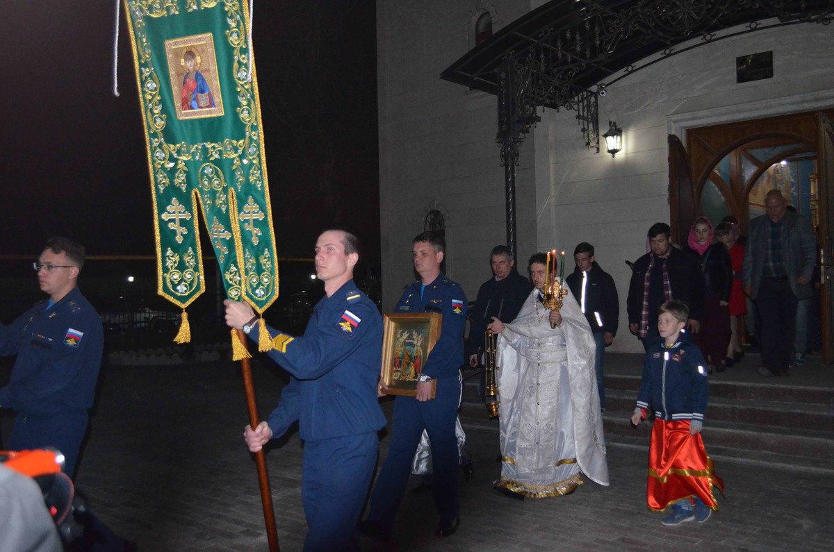 27 апреля в 23 часа под звон колокола и песнопения церковного хора открылись ворота храма и прихожане во главе с иереем Евгением, подобно женам-мироносицам, шедшим рано утром к гробу Спасителя, отправились на крестных ход, обойдя всю территорию авиабазы.