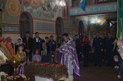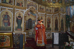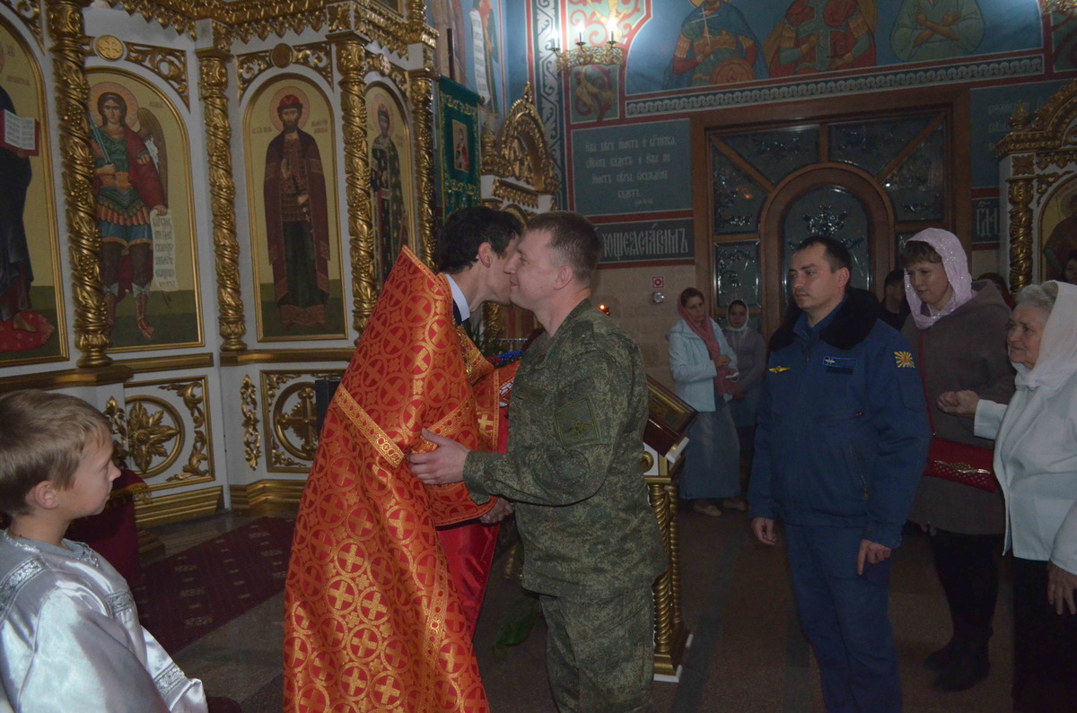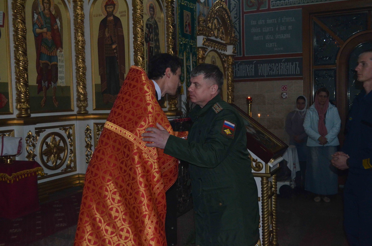 Шествие остановилось перед закрытыми дверями храма «Александра Невского», как бы у гроба Господня, и здесь же, на ступенях храма началась праздничная Утреня. Настоятель храма после обычного возгласа, начинающего Утреню пропел трижды тропарь Святой Пасхи: "Христос воскресе из мертвых, смертию смерть поправ и сущим во гробех живот даровав". Затем отец Евгений впервые произнес ликующее пасхальное приветствие "Христос воскресе!". Утреня продолжалась стихами древних пророчеств царя Давида о Воскресении. И только после этого ровно в полночь все православные вошли в храм под пение праздничного тропаря. Затем совершилась Божественная Литургия. За богослужением молился заместитель командующего войсками ЦВО генерал-майор Лемякин А.П. и личный состав авиабазы с членами семей.