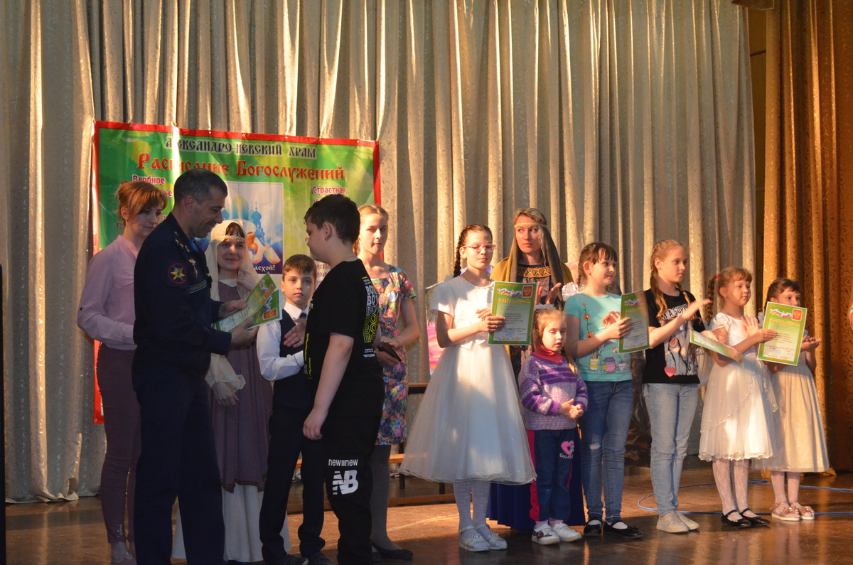 По окончанию выступлений начальник штаба, подполковник Сафонов Денис Валерьевич, вручил подарки детям и грамоту руководителю воскресной школы Ткаченко Евгении Александровне, которая ведет и развивает воскресную школу.