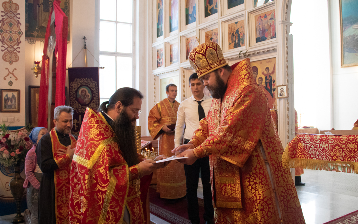 По завершении Божественной литургии епископ Даниил вручил Архиерейскую грамоту «за усердные труды во славу Святой Церкви и на благо Бишкекской и Кыргызстанской епархии» Тен Ирине Александровне, которая уже много лет помогает в ризной. Затем от всех православных христиан Кыргызстана Его Преосвященство преподнес в дар Свято-Успенскому Каприянскому мужскому монастырю в Молдове икону с частицей моще преподобного Ираклия Иссык-Кульского и в дар Храму Живоносного источника г. Милана в Италии частицу мощей преподобного. Обращаясь к священству Молдовы и Италии, владыка Даниил сказал: «Примите, пожалуйста, эти святыни как молитвенное напоминание о посещении нашей благословенной Кыргызстанской земли. И молитесь нашему святому – преподобному Ираклию Иссык-Кульскому, память которого празднуется 10 июня и 13 сентября».