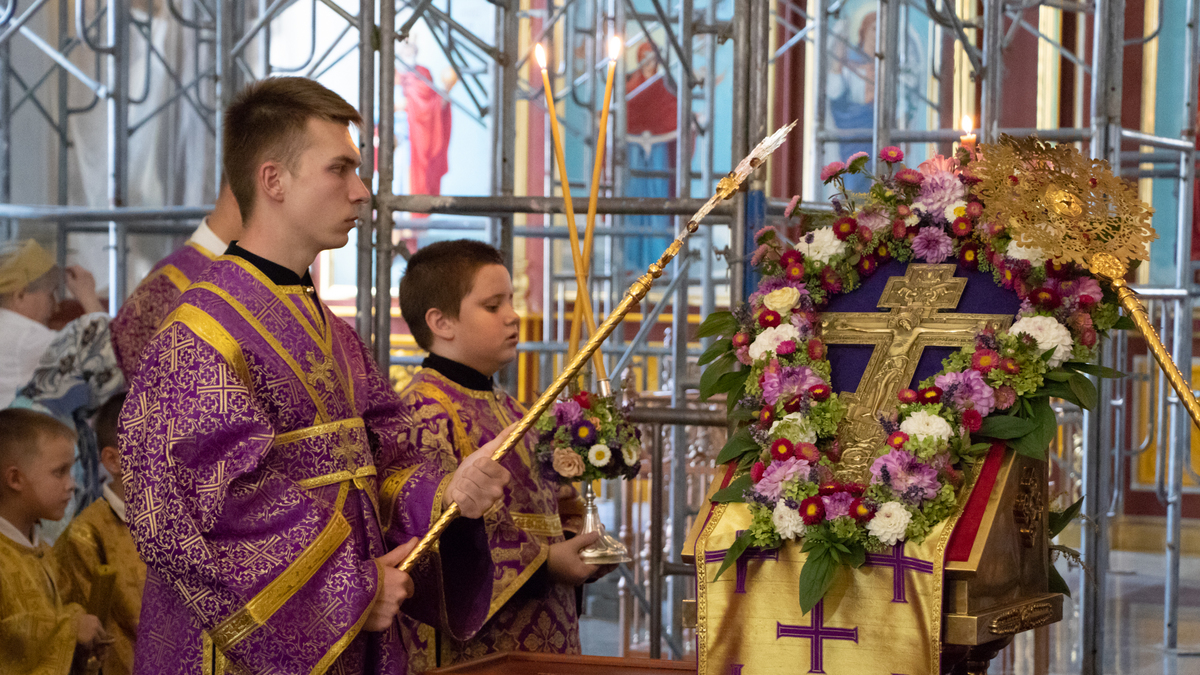 В конце богослужения, на утрени во время великого славословия, из алтаря для молитвенного поклонения верующих был изнесен Крест Господень.
