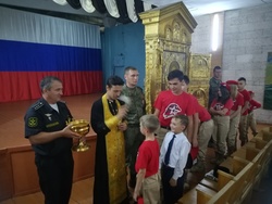 Личный состав, жители гарнизона и юнармейский отряд пришли в это день для участия в молитве перед образом Спасителя. Так же, с главной иконой доставляют и ковчег с частицами св.мощей покровителей родов и видов войск ВС РФ.