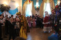 Немного в стороне от шумного праздника, за елкой, несколько персонажей. У них здесь свои истории. Малышка в голубом платье с бантом восхищенно разглядывает нарумяненную девочку постарше в пестром восточном одеянии с чалмой на голове. Подходит к ней, берет за руки, поднимается на цыпочки и спрашивает: « А ты кто? Баба Яга?»
