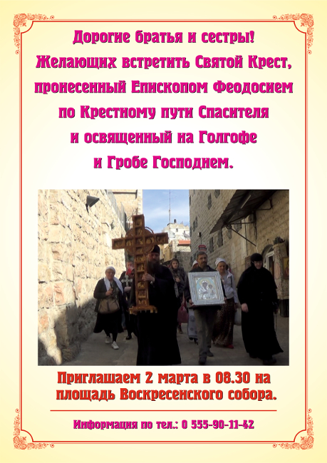2 марта в Кыргызстан Епископ Бишкекский и Кыргызстанский Феодосий доставит Святой Крест из Иерусалима, который Владыка пронес по Крестному пути Спасителя и освятил его, приложив к Голгофе и Гробу Господню. В Бишкеке в главном соборе столицы святыню будут встречать 2 марта в 08.30 утра.