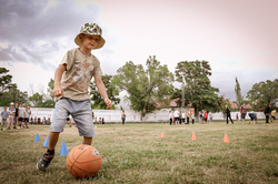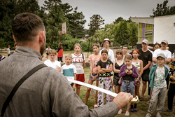 Программа фестиваля очень насыщенная. Второй день пребывание объявлен спортивным. Несмотря на дождливую погоду на большом футбольном поле прошли сразу три мероприятия – эстафета, футбол, фланкировка шашкой. Руководитель молодежного отдела иерей Илия Бойко рассказал историю шашки, объяснил функции составных частей и дал мастер-класс по искусству владения оружием.