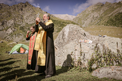 10 августа ранним утром все участники восхождения собрались в Свято-Воскресенском кафедральном соборе г. Бишкека, где был отслужен молебен перед началом доброго дела. Затем добрались до альплагеря, расположенного в государственном природном парке «Ала-Арча». От альплагеря предстоял путь до нижнего базового лагеря, расположенного в ущелье Адыгене. По пути следования на мемориальном комплексе альпинистов была совершена лития об усопших альпинистах и всех вождях и воинах за веру и отечество жизнь свою положивших.
