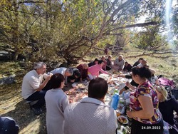 Утром следующего дня протоиерей Димитрий Шушпанов и матушка Татьяна заехали за нами в гостиницу, и мы все вместе поехали в ущелье Беш-Таш. Мы заехали в заповедник и надеялись увидеть акмаралов. Их привезли сюда в этом году в мае с Горного Алтая, но, как нам объяснили, для животный это был стресс, и они стали гибнуть. Чтобы сохранить поголовье акмаралов, их отпустили на волю, но при этом их подкармливают и наблюдают за ними с фотоловушек и дронов. Мы проехали вглубь ущелья и расположились на полянке рядом с одним из многочисленных родников. Матушка со своими верными помощницами развели костёр и приготовили обед, а мы, во главе с батюшкой, отправились исследовать местные красоты. Перейдя мостик с воротами, мы попали на территорию акмаралов и стали подниматься вверх в горы. По дороге встречали кормушки с солью для животных, потом обследовали небольшую пещеру. Чем выше мы поднимались, тем всё меньше становилась наша группа. Не у всех хватило сил и здоровья совершить такую прогулку по горам, и в итоге установила рекорд самая активная участница наших паломнических поездок Ольга. Спустившись к месту расположения и вкусно отобедав, мы снова во главе с батюшкой отправились через мостик в горы, но уже по другому маршруту. Мы шли вдоль быстрой речки с чистейшей ледяной водой, между старыми берёзками и елями. Здесь пейзаж был особенно красив, где мы и сделали множество фотографий на память об этом чудесном месте. Солнышко склонилось к горам и мы стали собираться в обратный путь. На выезде мы ещё успели посетить парковую зону отдыха, и, вернувшись в гостиницу, стали готовиться к Божественной Литургии.