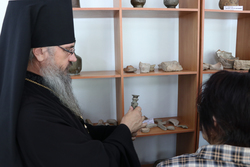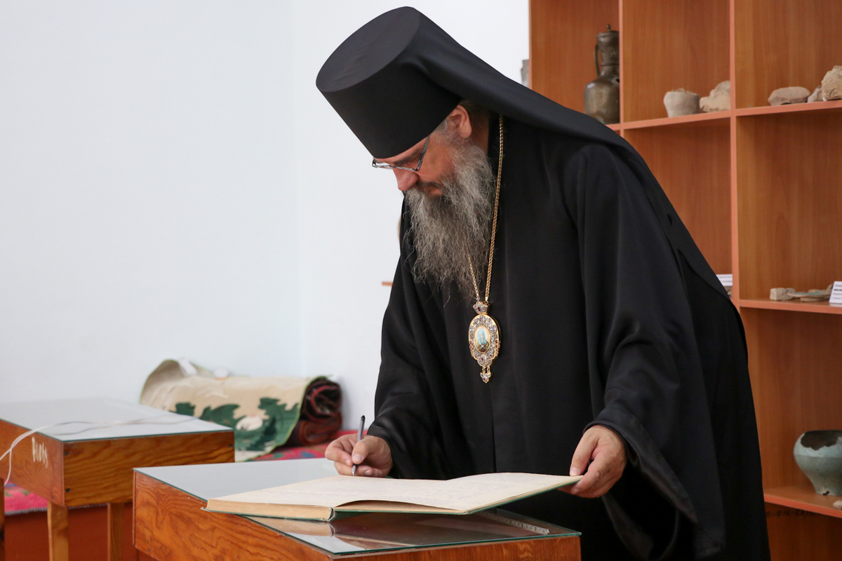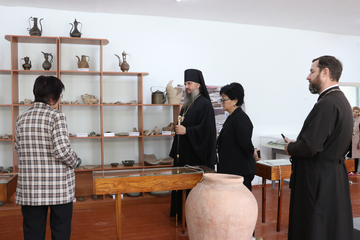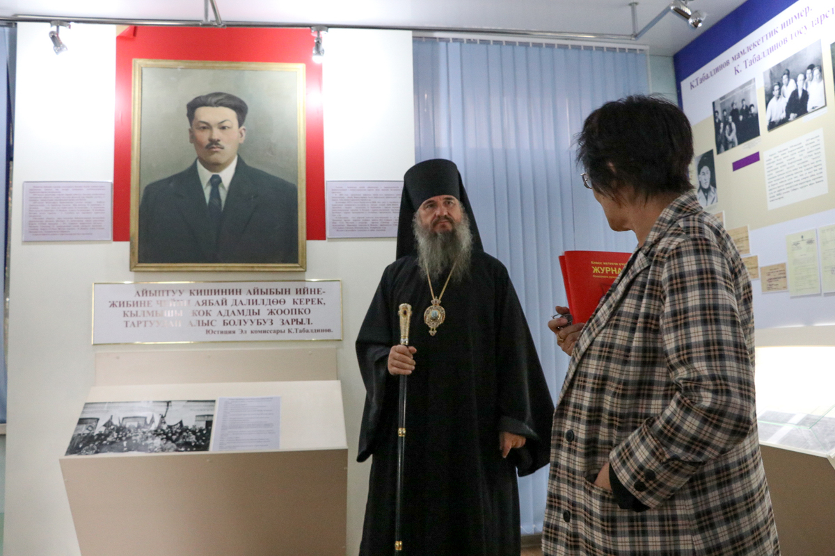 Группа из епархии во главе с владыкой побывала в Кара-Жыгачской средней школе им. Каратала Табалдинова, в одном из классных кабинетов которой находится школьный краеведческий музей.