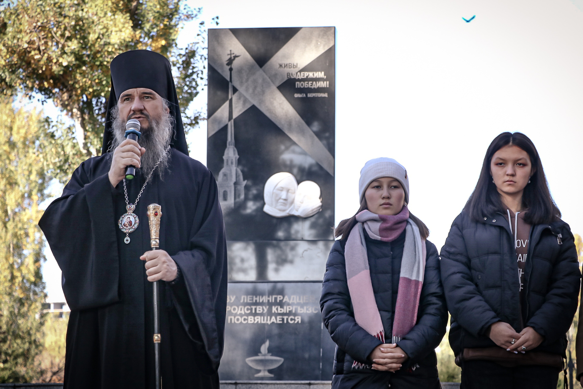 Обращаясь к участникам митинга, епископ Савватий отметил, что человеку должно быть свойственно подражать Господу и заботиться о нуждающихся. Во время Великой Отечественной Войны Кыргызстан входил в состав СССР и принимал участие в оказании помощи эвакуированным из блокадного Ленинграда людям. Владыка упомянул о подвиге Токтогон Алтыбасаровой, которая в возрасте 16 лет приняла под свою опеку 160 голодных и обессиливших от горя и болезней детишек. И выходила всех до одного. «Эта юная девушки и люди, подобные ей, готовые не задумываясь прийти на помощь, не считаясь со своим положением - люди с большой буквы. И нам, вспоминая эти события, нужно возвышать себя до такого мироощущения. В те далекие и тяжелые времена это была естественная реакция - помочь тому, кто в этом нуждается. Вот такое человеческое состояние души должны воспитывать все люди: священники, родители, преподаватели. Школы, институты культуры, средства массовой информации - каждый, от кого зависит мировосприятие народа. Мы все ответственны перед Богом, обществом и перед теми, кого мы воспитываем. Дай Бог нам всем, вспоминая трудности блокадного Ленинграда, изменить себя к лучшему».