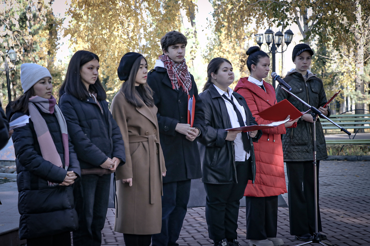 В митинге-реквиеме участвовали блокадники, ветераны ВОВ, учащиеся и преподавательский состав Владимирской школы, лицея им. Даира Асанова, студенты финансово-экономического техникума.