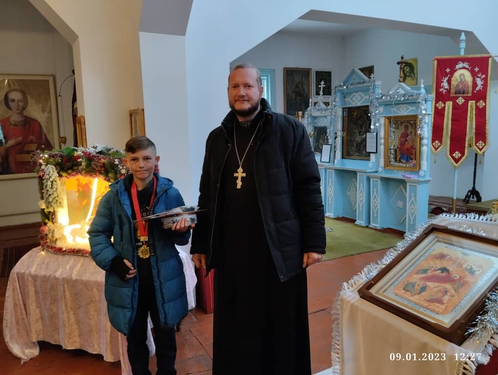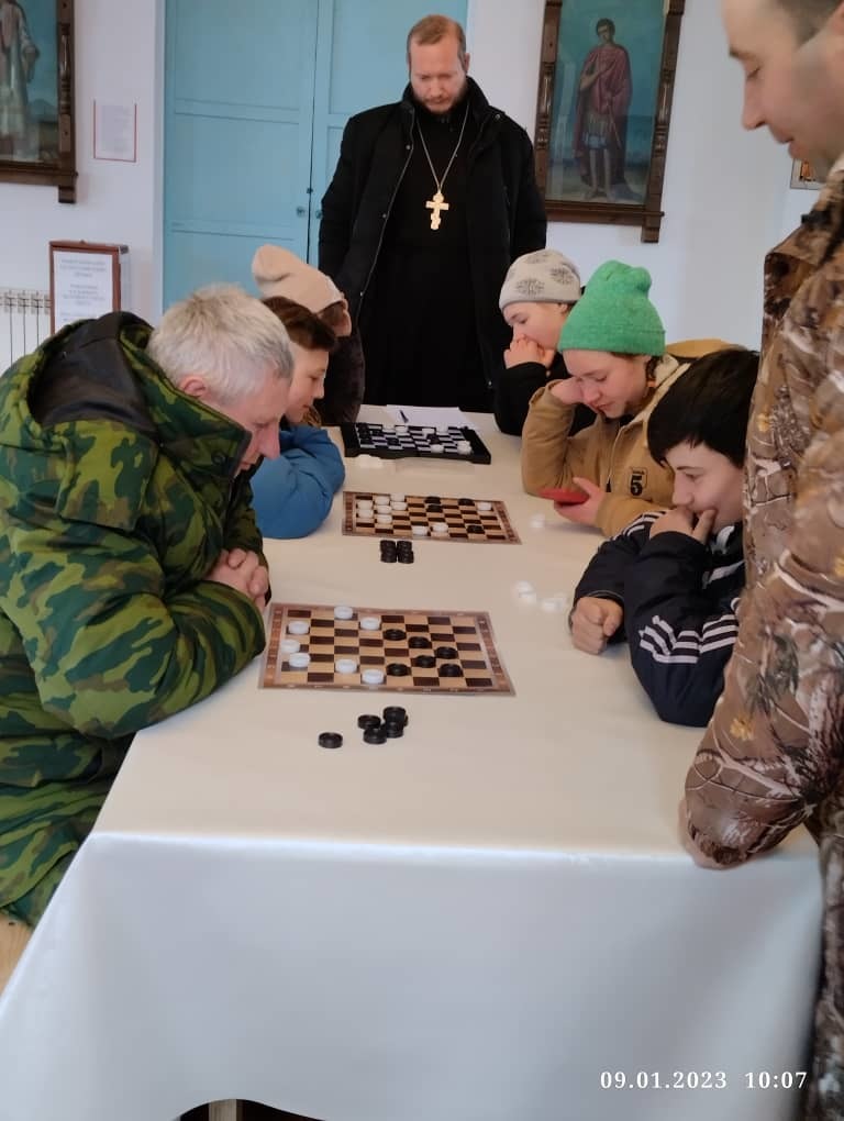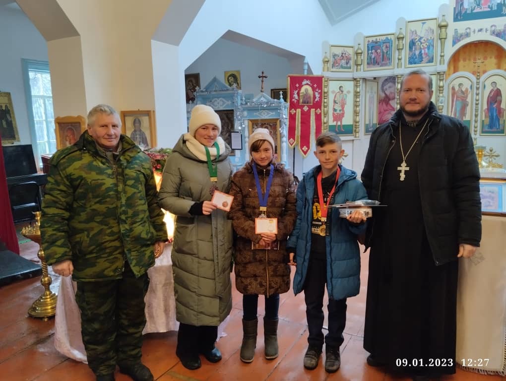 Первое место занял участник Олег Куликов. Второе место – Юлия Куликова. Третье место Дарья Малышева. Каждый из этих трёх участников получил призовую медаль со своим удостоверением, небольшие подарки в виде шоколадки и шоколадных конфет, победитель же ещё набор игровых шашек. Другие участники, не занявшие призовые места, тоже получили утешительные призы в виде шоколадки и шоколадных конфет. Все призы были подготовлены группой прихожан храма совместно с казаками.