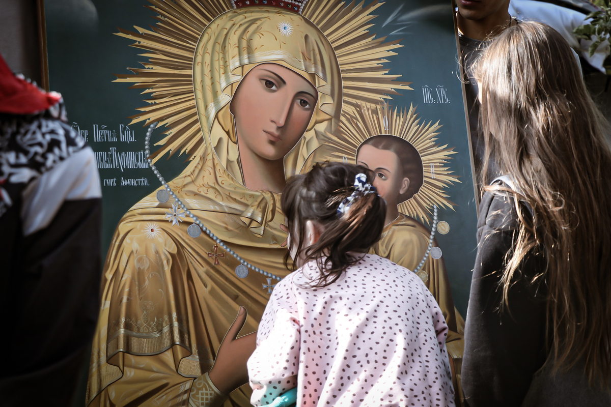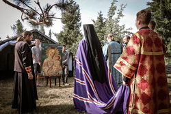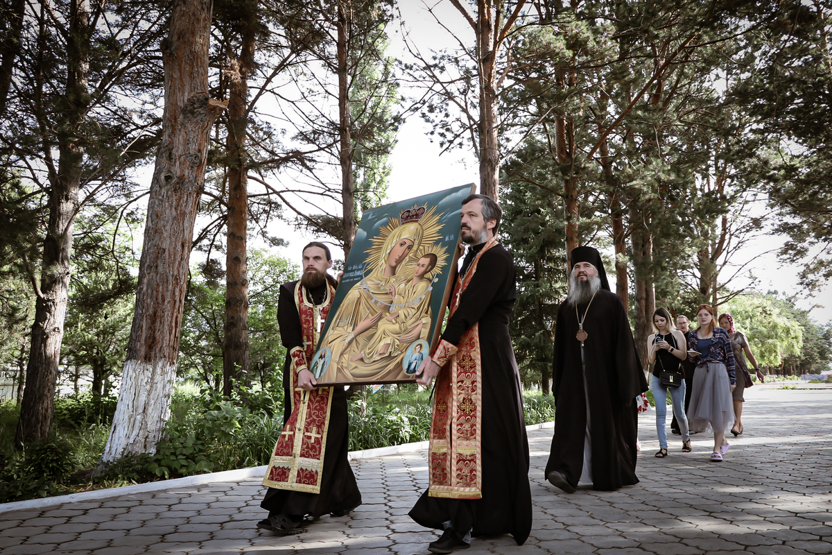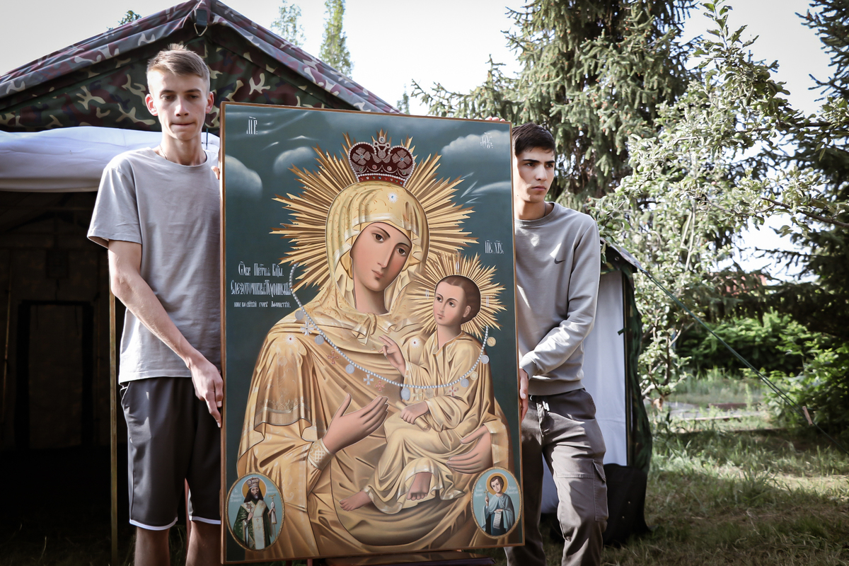 На детско-юношеский фестиваль из Бишкека привезли список Тихвинской иконы Божией Матери. Сразу после утреннего правила, епископ Савватий совершил молебен перед образом. По завершении богослужения дети прикладывались к списку, а владыка помазывал их освященным елеем. Затем Его Преосвященство обратился к присутствующим с архипастырским словом.