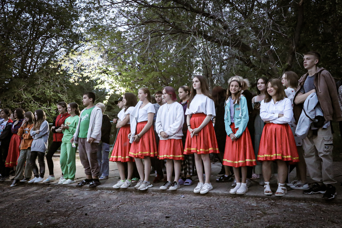 Первым номером программы стал задорный, русский танец «Барыня», которую исполнили учащиеся танцевальной групп и парни-вожатые. Искрометный, красивый, костюмированный танец вызвал бурю эмоций. Весь танец сопровождался аплодисментами зрителей.