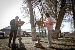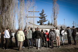 После обеда группа отправилась к дальнейшей цели - поклонному Кресту на месте Братской могилы убитых в годы репрессий в с. Тюп. На могиле была совершена заупокойная лития и была рассказана история этого места. Далее отправились в село Ананьево, на кладбище на котором был похоронен преподобноисповедник Ираклий Иссык-Кульский. На могиле был отслужен молебен святому. Последней точкой паломничества стал храм во имя святой блаженной Ксении Петербургской, в котором молодые люди приложились к точной копии Годеновского Креста. Была рассказана история храма и краткая история жизни его строителя, митрофорного протоиерея Валентина Никонова. Батюшка был любим многими верующими и был настоящим исповедником веры в наши дни. Несмотря на множество испытаний и притеснений нес большое количество трудов на благо Церкви и во славу Божию.
