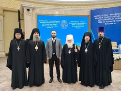 Участники панельной дискуссии от РПЦ: епископ Бишкекский и Кыргызстанский Савватий, Зампредседателя ОВЦС архимандрит Филарет (Булеков).