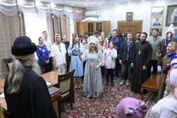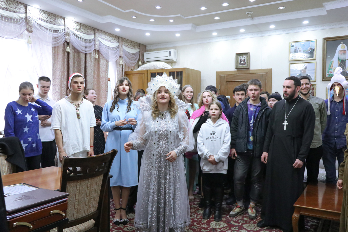 Конечно же, какой рождественский праздник обходится без традиционных колядок - песнопений, прославляющих Рожденного Богомладенца. Посоревновавшись на знание необычных колядок, молодежью было принято решение поделиться радостью и поздравить архиерея. Веселой гурьбой христославы отправились к епископу Савватию и исполнили колядку «Слава в вышних Богу!» Поблагодарив молодежь, владыка одарил ребят сладостями и конфетами.