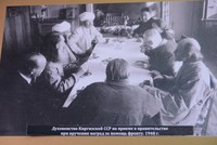 Следующий раздел экспозиции посвящен Великой Отечественной войне. В это время власти позволили Церкви возобновить свою деятельность, были освобождены священнослужители из мест заключения, было разрешено возобновить типографскую деятельность, строить и восстанавливать храмы. Так, во Фрунзе в 1945 г. православным верующим было передано здание, которое сегодня является Свято-Воскресенским собором. В витринах экспозиции можно увидеть первые, совсем скромные, послевоенные издания Московского Патриархата, богослужебную литературу и епархиальные информационные сборники, распечатанные на машинке.