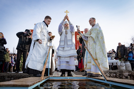 После литургии епископ Савватий совершил чин Великого освящения воды на иордани, устроенной на восточной части территории Свято-Воскресенского кафедрального собора.