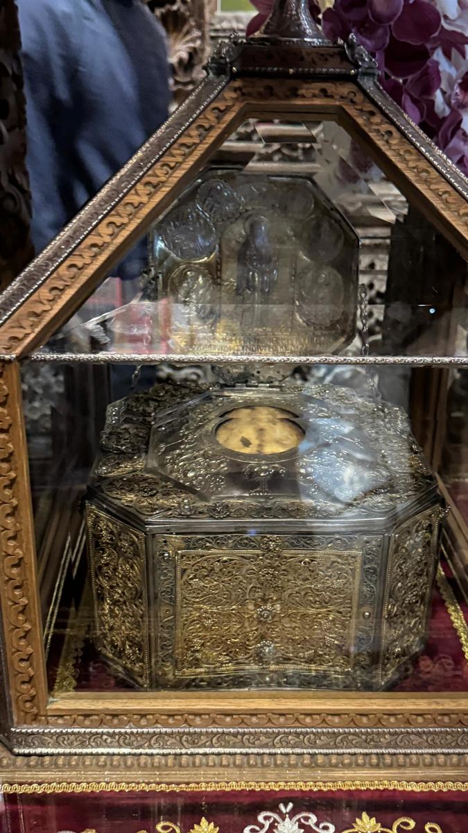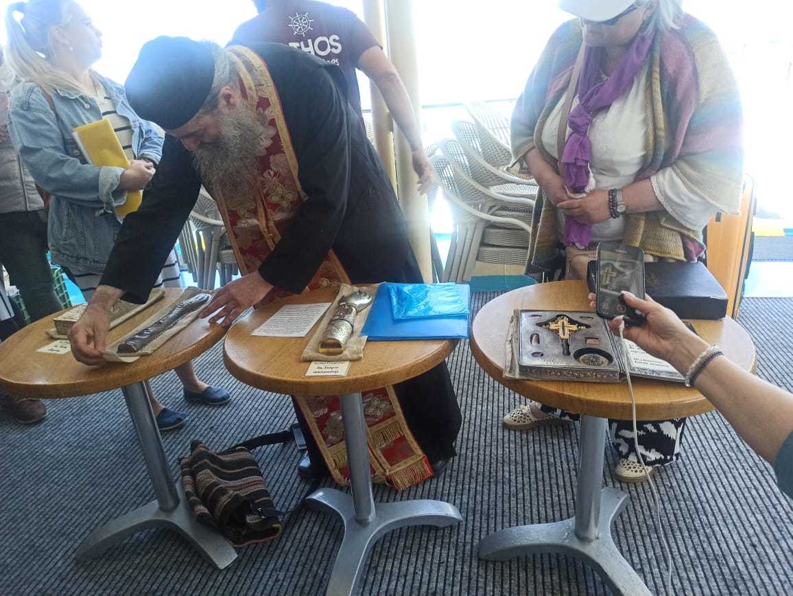 Катер с монахами привез святыни Афона, включая частицы креста Господня и мощи святых Василия Великого, Георгия Победоносца, Пантелеимона Целителя и св. Марины, которые были переданы паломникам с благоговением.