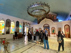 Затем паломники посетили Свято-Георгиевский мужской монастырь в Чирчике, где их встретили чудотворные иконы Божией Матери «Достойно есть» и «Экономисса».