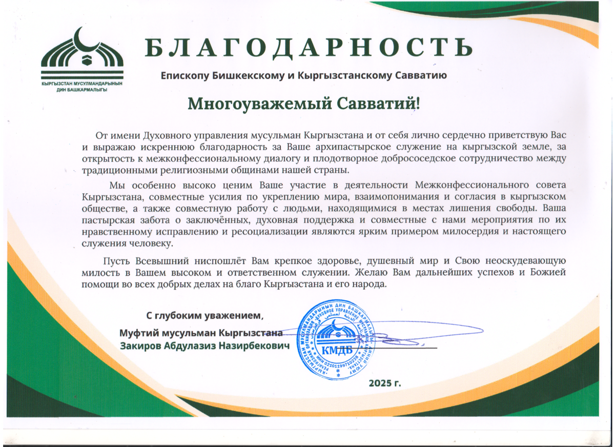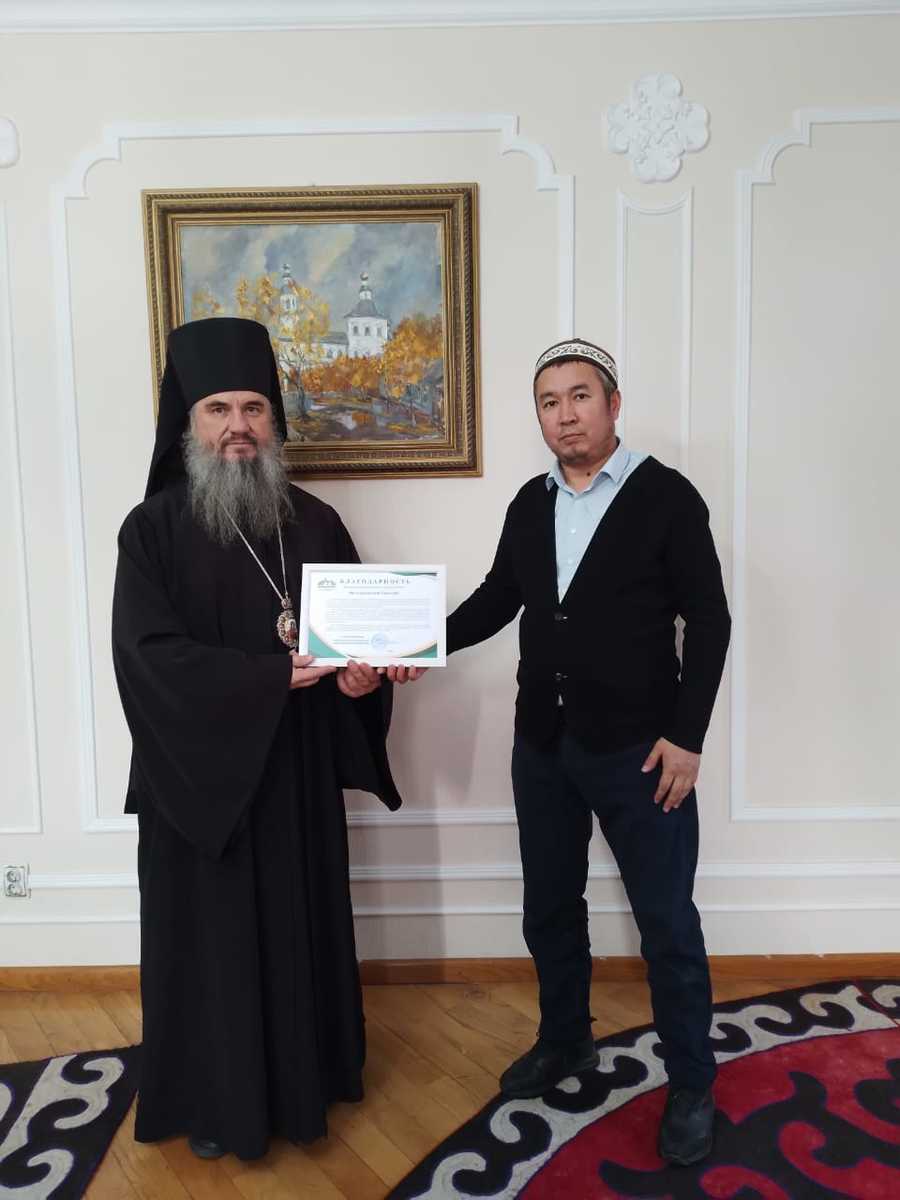 Целью визита стало личное вручение благодарственной грамоты от Муфтия Кыргызстана, адресованной правящему архиерею Бишкекской епархии. В документе выражена признательность за архипастырское служение на кыргызской земле, открытость к межконфессиональному диалогу и добрососедское взаимодействие между традиционными религиозными общинами страны.