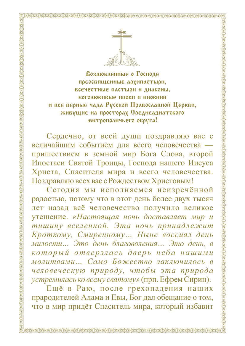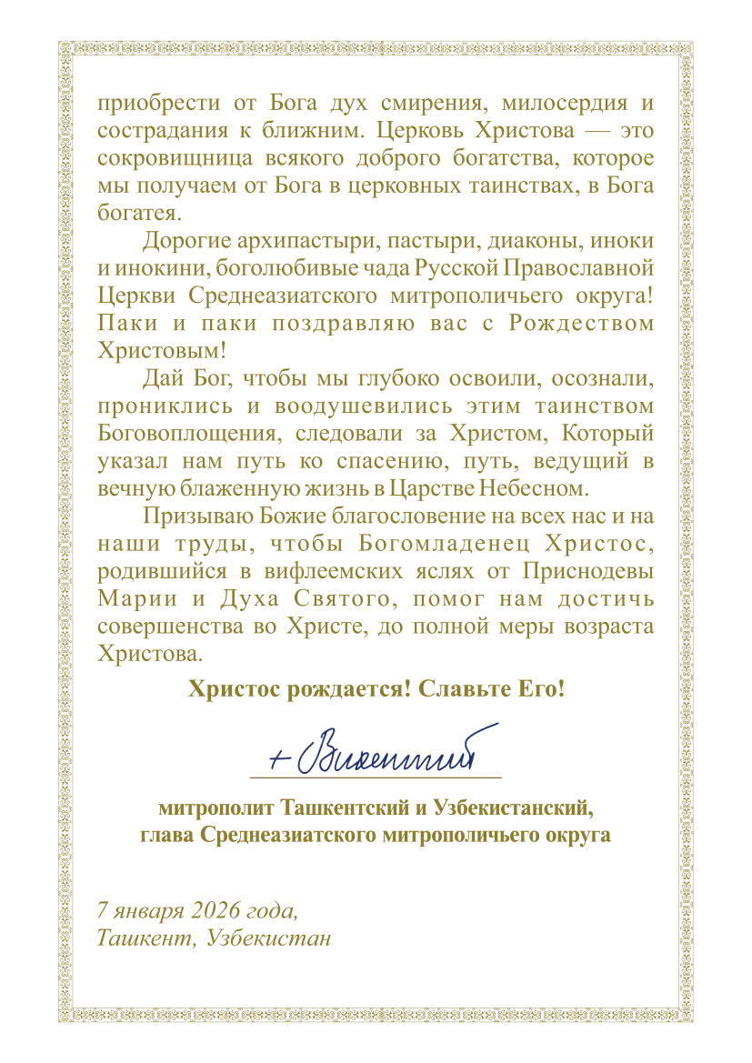Рождественское Послание главы Среднеазиатского митрополичьего округа митрополита Ташкентского и Узбекистанского Викентия