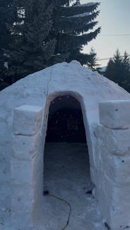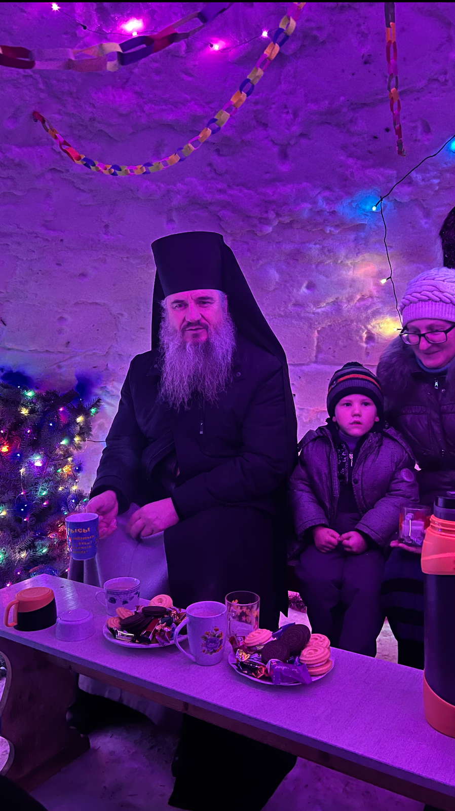 Во второй половине дня епископ Савватий направился в село Теплоключенка, где, в храме влкм. Дмитрия Солунского совершил рождественскую вечернюю службу. По ее окончании верующие собрались в импровизированной ледяной пещере: здесь звучали колядки, а настоятель храма, иерей Алексей Данилов угощал всех горячим какао.