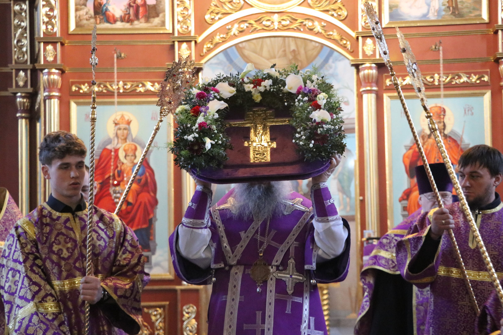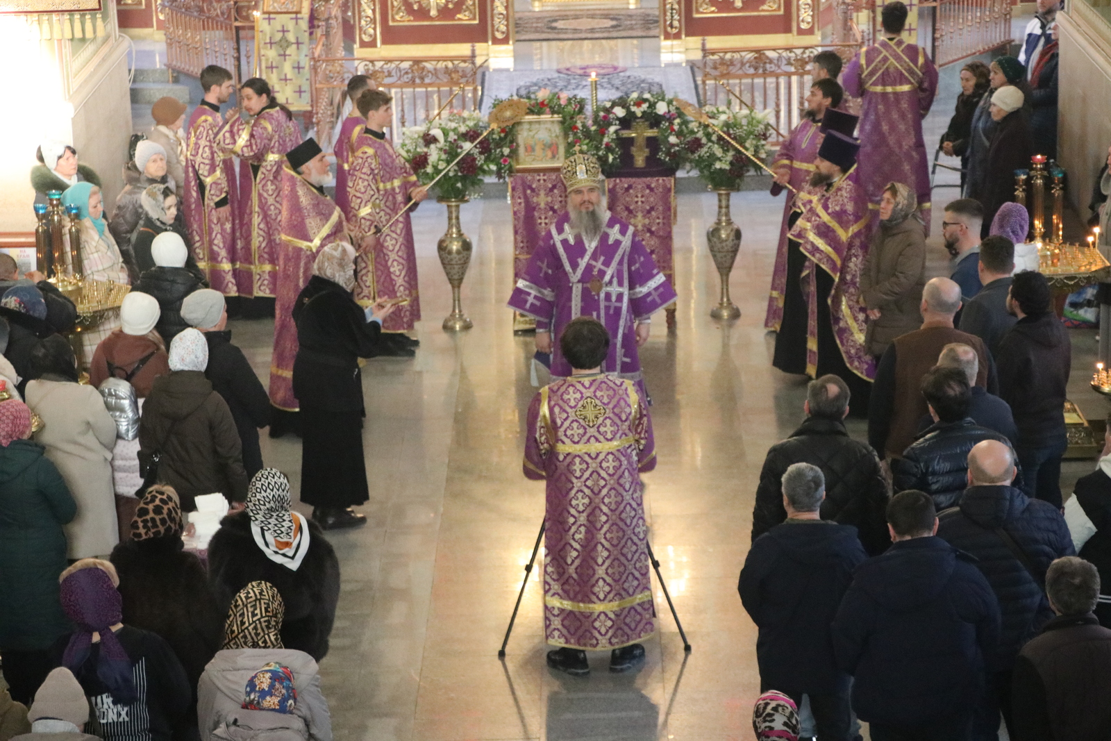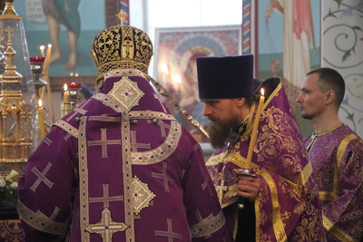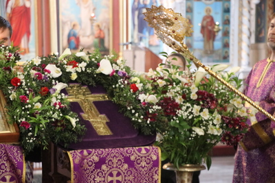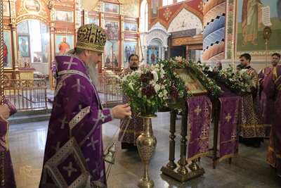 Главным моментом богослужения стал вынос Животворящего Креста. После пения великого славословия архипастырь вынес из алтаря украшенный цветами Крест Господень и установил его на середине храма для поклонения верующих.