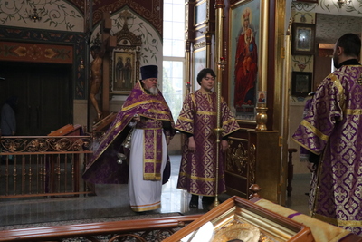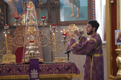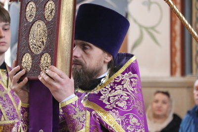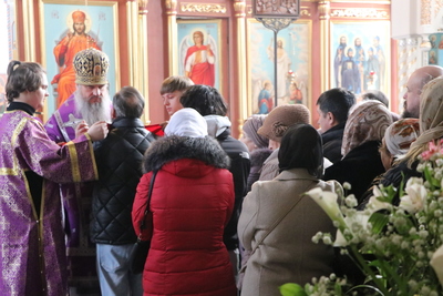 По завершении Божественной литургии духовенство и прихожане совершили поклонение Животворящему Кресту, который будет находится в центре храма в течение всей Крестопоклонной недели.