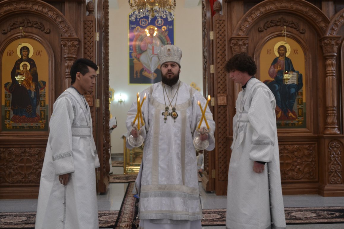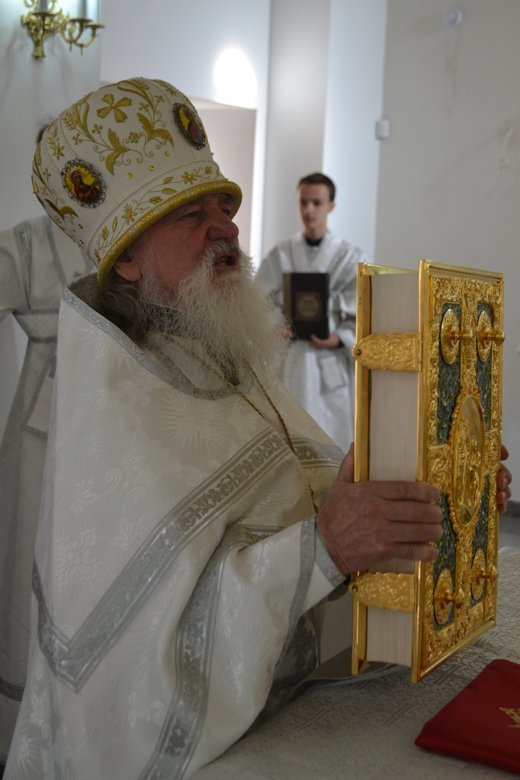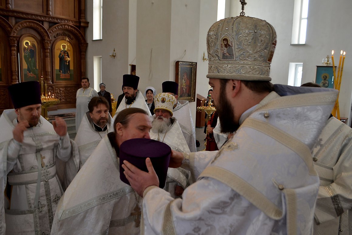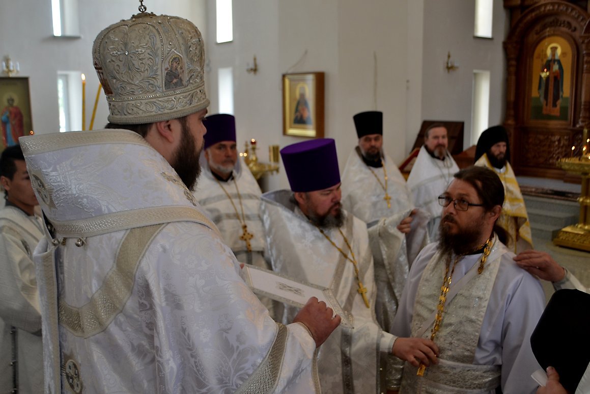 При совершении входа со святым Евангелием Его Преосвященство, епископ Даниил к празднику Святой Пасхи удостоил высоких церковных наград священнослужителей епархии: