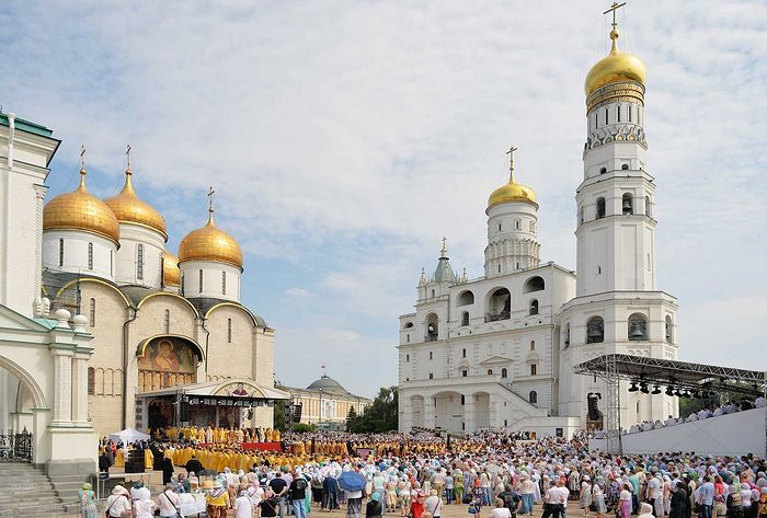 Богослужение на Соборной площади совершалось впервые. Престол был установлен на помосте у южной паперти Патриаршего Успенского собора.