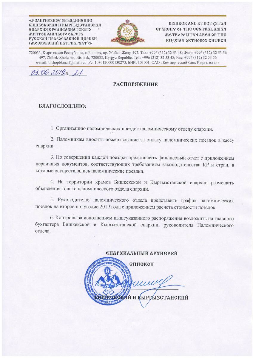 Вышло новое распоряжение по поводу деятельности паломнического отдела Бишкекской и Кыргызстанской епархии